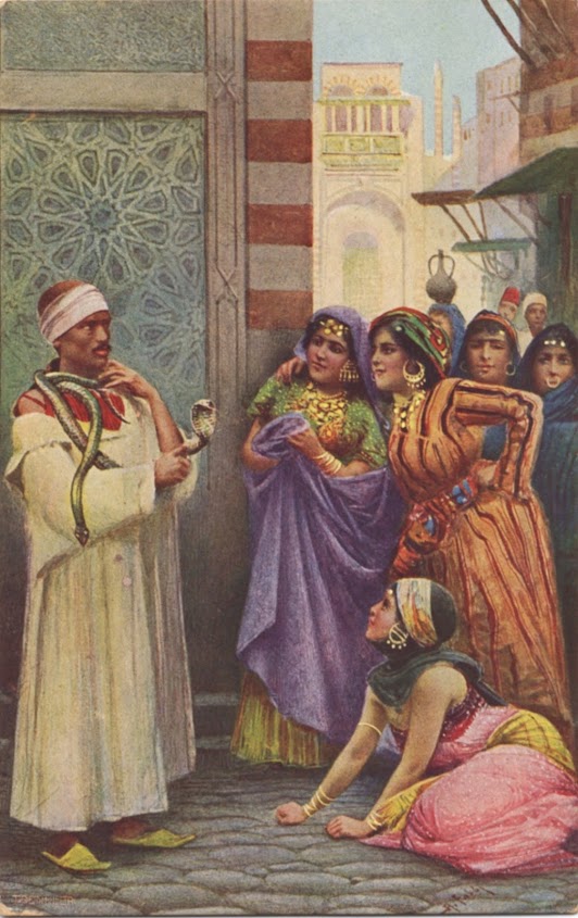 An adoring group of female admirers have gathered to pay homage to the courage and skill of the neighbourhood snake handler. Look closer and all may not be as it seems - even though one of the group has fallen to her knees in homage, their expressions suggest they are less impressed and have sensed the defensive air of insecurity on the part of the snake handler. A lack of confidence can be read in his facial tension and his audience appear to be close to dissolving into scornful mirth. The stereotypical imagery falls clearly under the umbrella of Orientalism in its dependence on the exotic. I have another postcard of an Egyptian snake charmer that looks suspiciously like the same person - even the serpents look the same. Other examples are from Myanmar, India and Sri Lanka. Closer to home is the demonic grin of Henry Brusher Mills (1840-1905), celebrity snake catcher of the New Forest, pictured here with a fistful of writhing specimens. Charming was not part of his act. Armed with a forked stick he offered his services to anxious homeowners and it has been calculated he caught over 30,000 snakes in his lifetime - some of which were rendered down to create various dubious potions, others were boiled to reveal their skeletons for sale to tourists. In a rare interlude when not snake bothering, he lit up a pipe and sat for his portrait - the result can be seen here. After his death in 1905 he was buried beneath a rather handsome headstone in the churchyard at Brockenhurst, where you can now take a drink at the Snakecatcher pub.